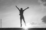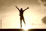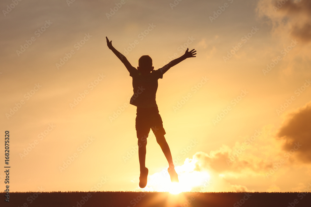 Silhouette Of Child Jumping Against Vibrant Sunset Sky Depicting Freedom And Joy