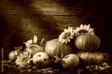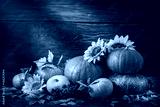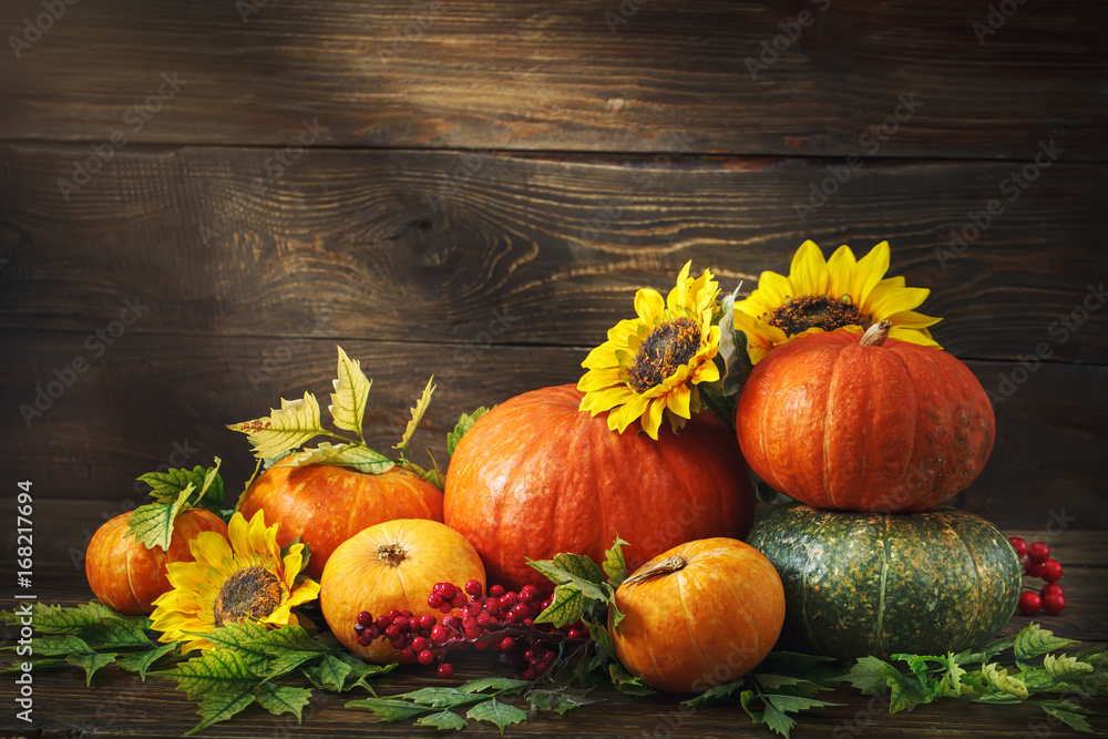 Happy Thanksgiving Day background, wooden table, decorated with vegetables, fruits and autumn leaves. Autumn background.