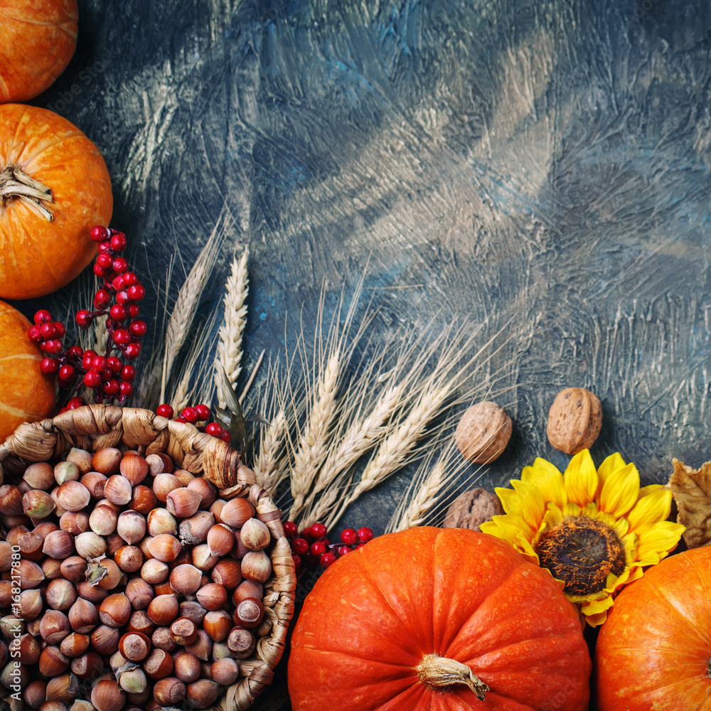 Table decorated with pumpkins and . Harvest Festival,Happy Thanksgiving.