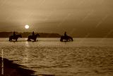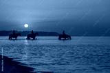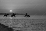 Horses bathe in the sea at dawn. Background of the beautiful sky and sunrise