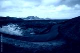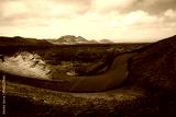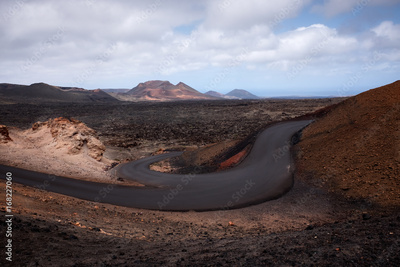 Lava fields and road in the territory of the national volcanic park of Timanfaya, the island of Lanzarote
