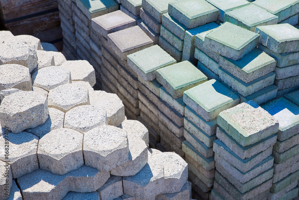 Stack of concrete self locking flooring blocks on wooden pallet in a construction site - used in construction industry to create permeable floors to rain water on a layer of sand