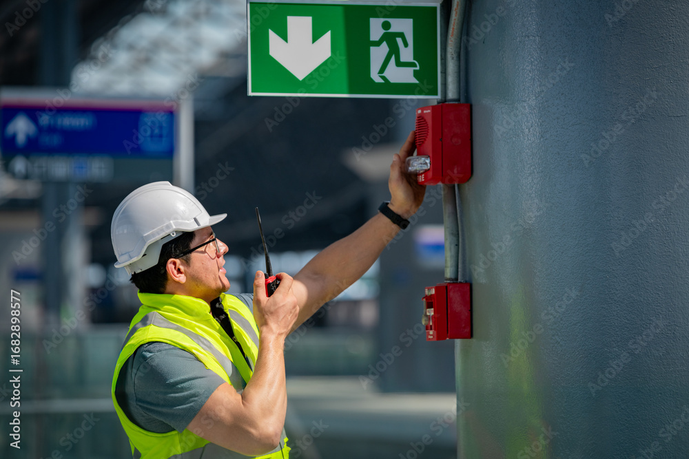 Safety engineer checking fire alarm system public building using a walkie-talkie inspecting emergency equipment an exit sign highlights workplace safety fire prevention and building maintenance.