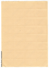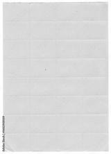 Bogen mit 8x4 Etiketten aus Papier, perforiert, Kanten bestoßen als Textur oder Layer für Collage mit Etikettenbogen