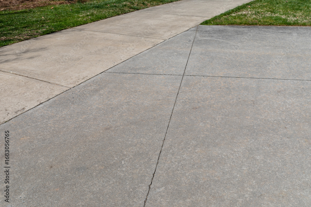 Narrow concrete path feeding into a wider concrete area, green grass and creative copy space, horizontal aspect