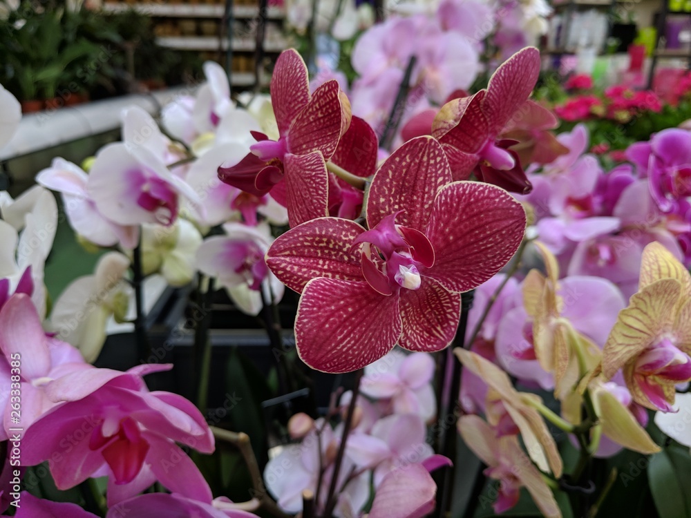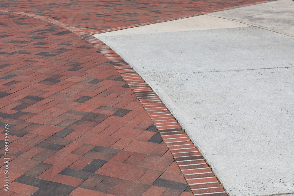 Intersection of brick paths with concrete pads, sweeping curve creative copy space, horizontal aspect