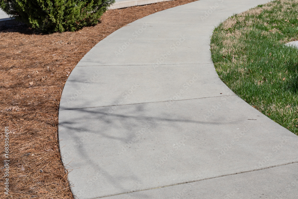Sweeping concrete walkway flanked with grass and pine straw landscaping, creative copy space for walking theme, horizontal aspect