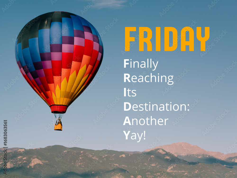 A graphic explains the acronym for FRIDAY as "FINALLY REACHING ITS DESTINATION: ANOTHER YAY," with an illustration of a hot air balloon. Travelling concept