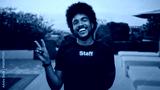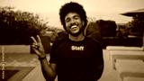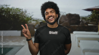 Man with afro smiling in staff uniform outdoors at hotel pool resort showing peace sign surrounded by greenery and white furniture capturing friendly hospitality vibe
