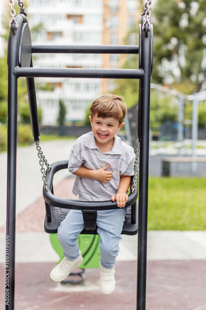 Happy kid on playground swing outdoors