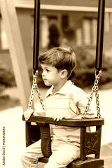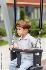 Little boy sitting still on swing in city park