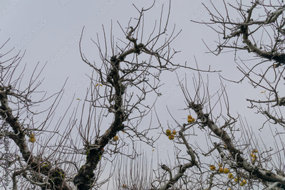 Gnarly apple trees in winter, tree still bearing fruit, no leaves, aging productivity metaphor, horizontal aspect