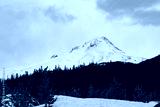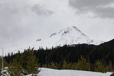 Snow covered Mt Hood on a dark winter day, bleak winter landscape background, horizontal aspect