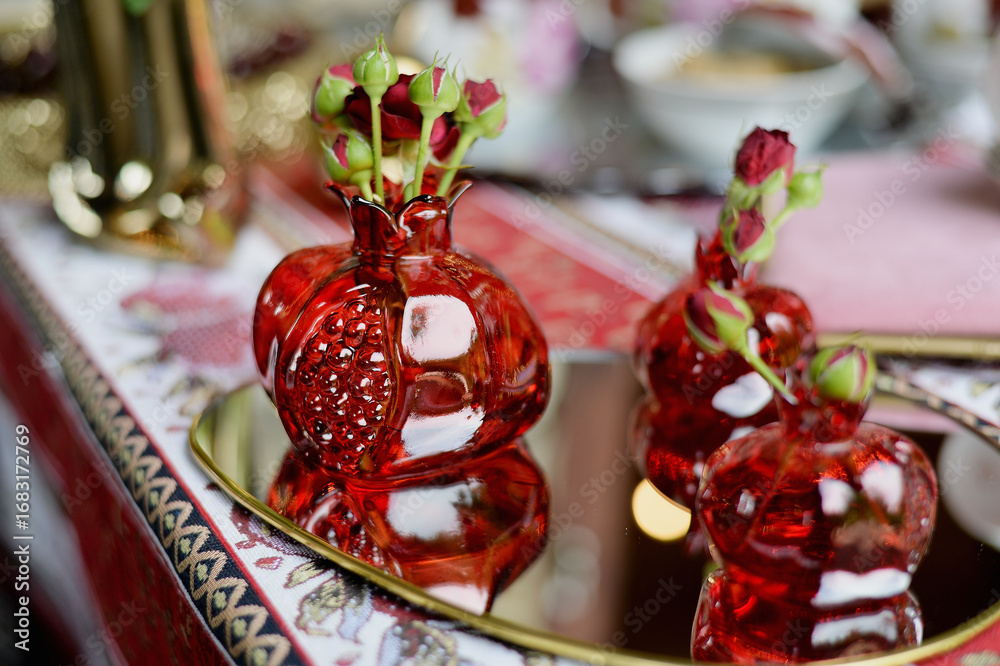 Red decorative vase in the shape of a pomegranate. Wedding table d cor. Gold and white