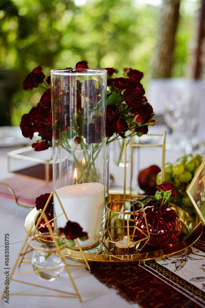 Red decorative vase in the shape of a pomegranate. Wedding table d cor. Gold and white
