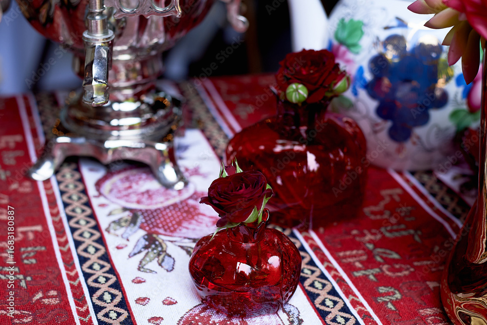 Red decorative vase in the shape of a pomegranate. Wedding table d cor. Gold and white