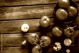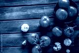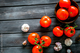 Tomatoes harvest. Vegetables near garlic, greenery and spices on wooden background top-down frame copy space