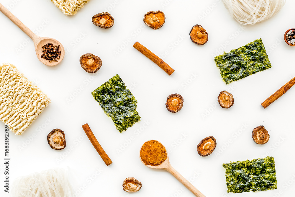 Rice vermicelli, noodles, spices, weeds, mushrooms pattern to cook Chinese, Japanese food on white background top view
