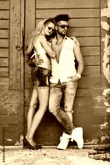 Portrait of young fashionable couple in love, joyful smiling expressions with heads together. Concept Loving Couple. Black and White Image.