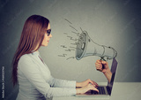 Woman in glasses sitting at table using working on a computer with megaphone poking out from a laptop screen