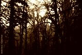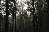 Filtered light in a winter landscape of thick, mossy trees, Pacific Northwest forest, horizontal aspect