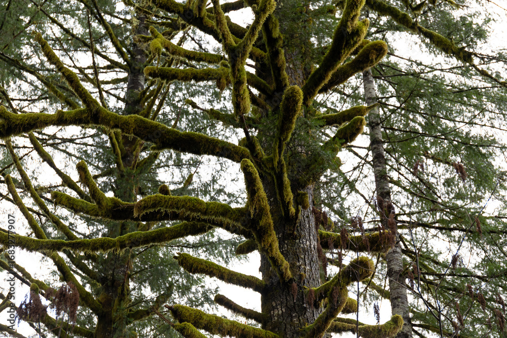 View looking up through trees covered deeply in moss, Oregon Pacific Northwest landscape on a cold winter day, horizontal aspect