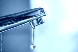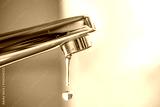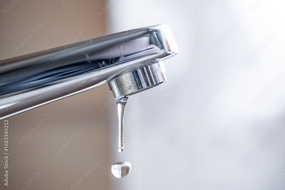 Dripping tap with water droplets inside apartment bathroom. Macro, close up shot, shallow depth of field, no people