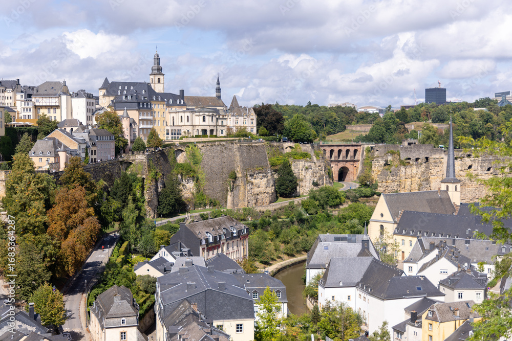 Panoramic view of Luxembourg City's skyline showcasing historic fortifications, the Grund district, and the Alzette river during a sunny autumn day