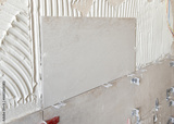 Process of tiling a bathroom wall, closeup. Construction or rennovation of a house