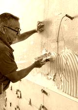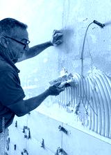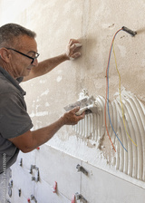 Craftsman spreads tile adhesive with trowel on a house wall, hand closeup. Construction process