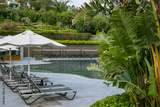 Empty Sunbeds and Umbrellas in a Raw in a Pool Area