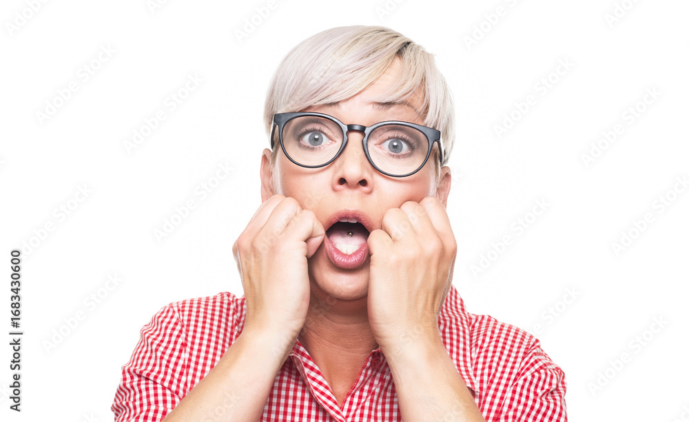 Shocked adult woman, isolated on white background. Astonished middle aged woman. Bad news.