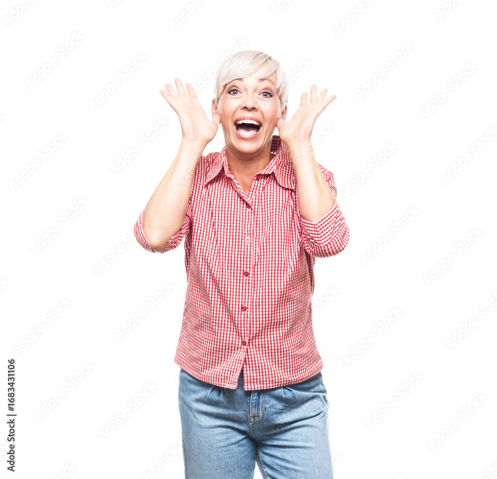Surprised woman looking to you, isolated on white background. Freak out middle aged woman.