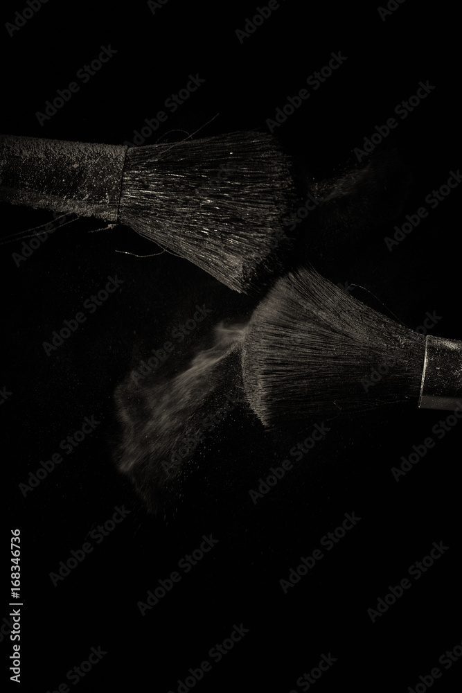 Make up brush with purple dust on black background
