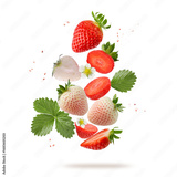White and red strawberry berries with flowers and leaves flying falling isolated on white background.