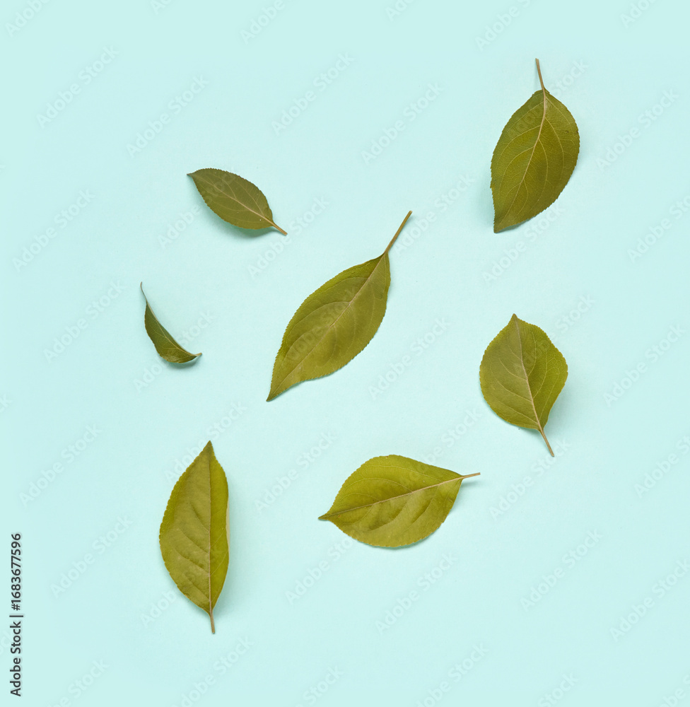 Green leaves with stems arranged on light blue background in minimalist pattern aesthetic.