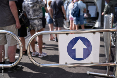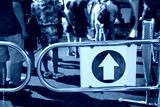 Diverse crowd with upward direction sign outdoors on sunny day.