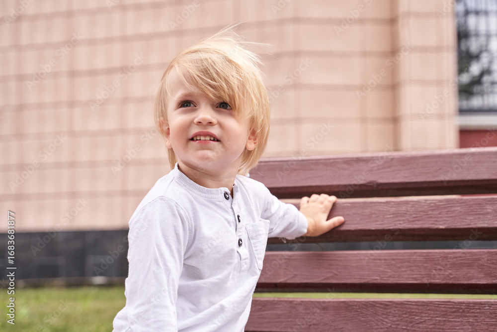 Caucasian male child with blonde hair sitting on a bench outside smiling.