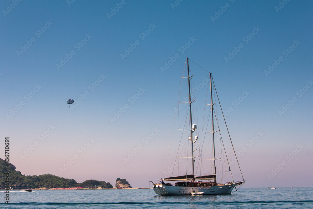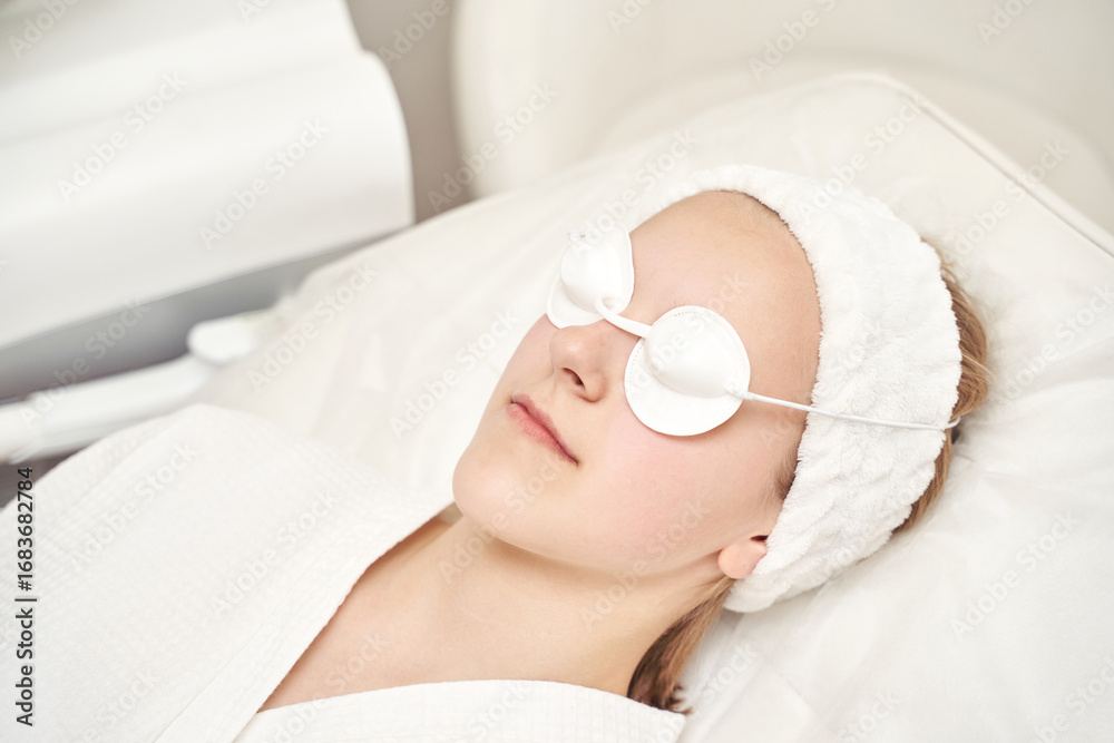 Young caucasian female in spa undergoing facial treatment with protective eyewear relaxing on treatment bed.