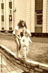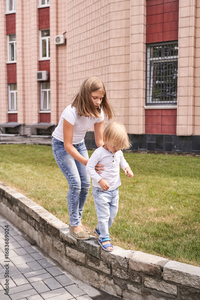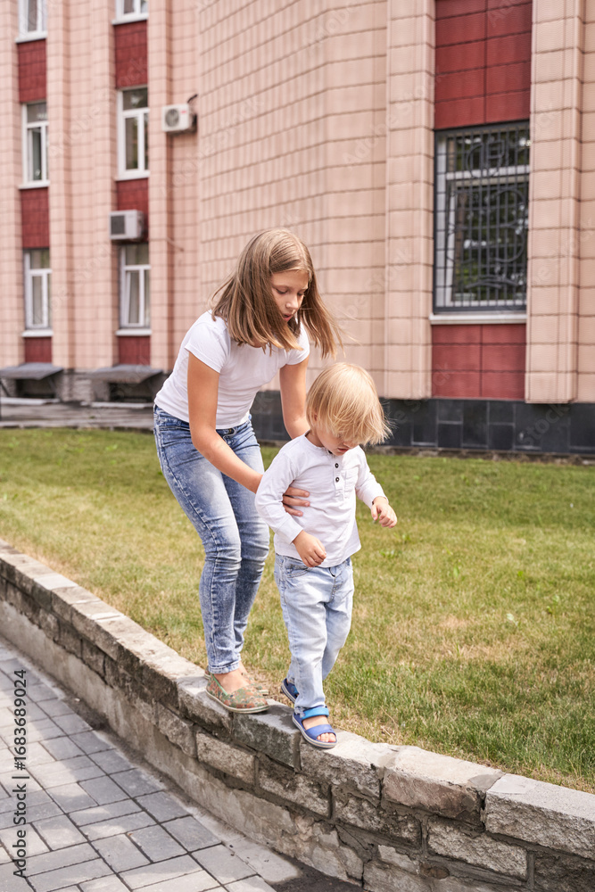 Caucasian female teen with blonde child walking on wall outdoors in casual outfits.