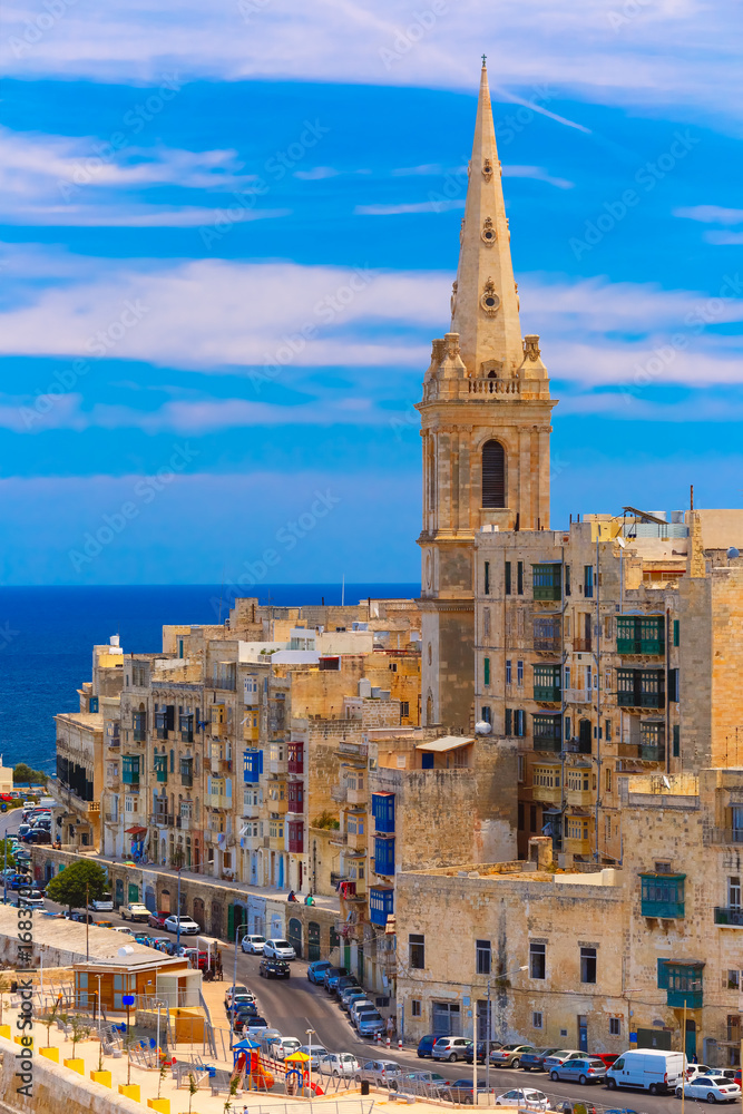 View from above of roofs and St. Paul's Anglican Pro-Cathedral, Valletta, Capital city of Malta