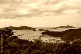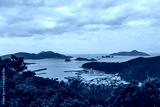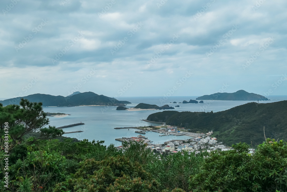 From a lush green vantage point, a coastal village and its harbor nestle peacefully in a calm bay, surrounded by rolling green hills and the sea of the Kerama Islands archipelago in Okinawa, Japan.