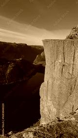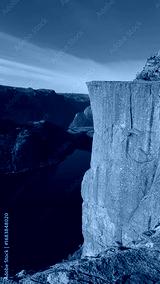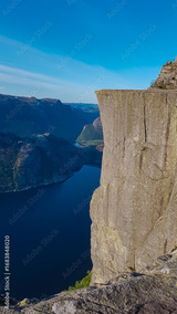 The iconic Preikestolen, or Pulpit Rock, juts out majestically, its sheer cliff face towering over the deep blue waters of the Lysefjord, showcasing the raw beauty of Norway's natural landmarks.