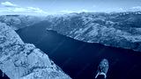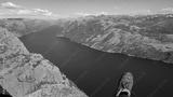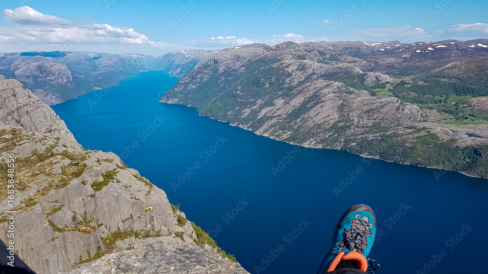 A first-person perspective from a hiker sitting on the edge of a massive cliff, with a hiking boot in the foreground, overlooking the stunningly deep blue Lysefjord and surrounding mountains in Norway