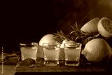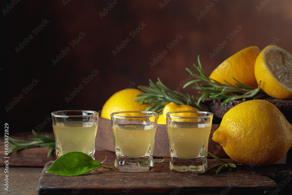 Italian liqueur Limoncello with fresh lemons and rosemary branches.