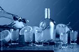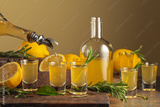 Italian liqueur Limoncello with fresh lemons and rosemary branches.
