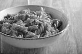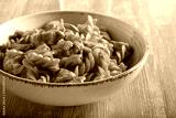 Chicken breast and pasta in tomato sauce, served