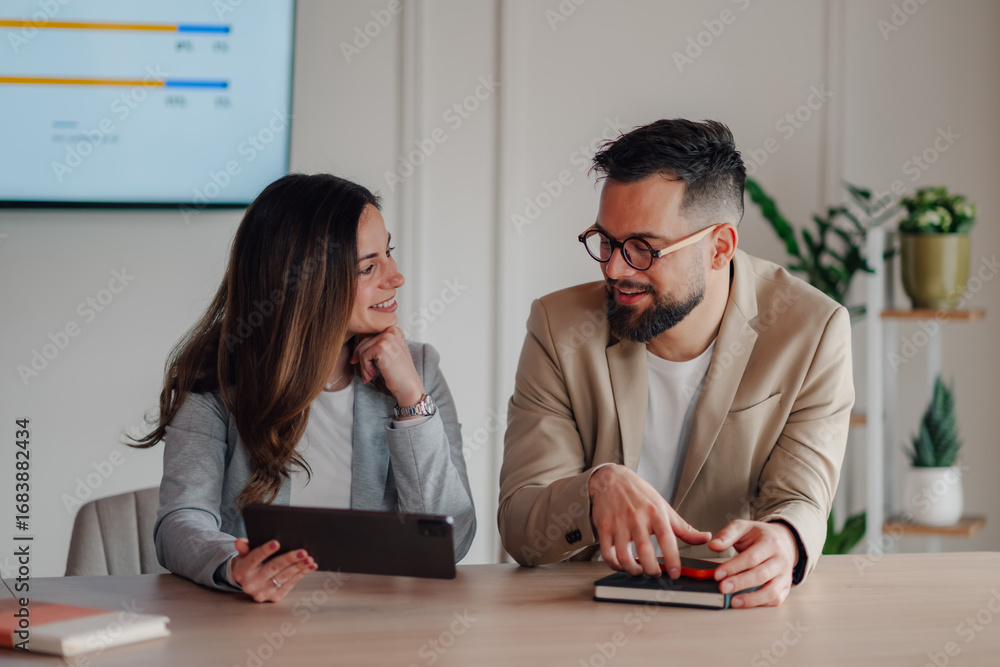 Business colleagues exchanging ideas during meeting using tablet and notebook
