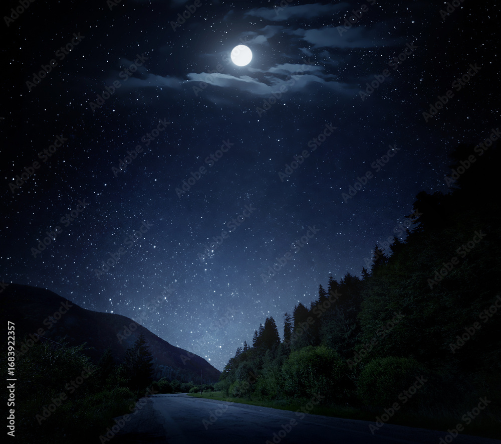 Night view of the road, forest and mountains. Night sky with moon and stars.