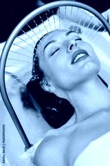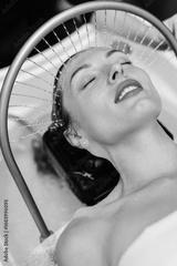 Woman enjoying hydromassage therapy in a serene spa setting, water cascading gently over her head, promoting relaxation and rejuvenation through aqua massage techniques